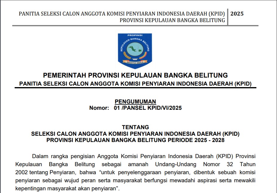 PANGKALPINANG — Pemerintah Provinsi Kepulauan Bangka Belitung (Pemprov Babel) kembali memberikan peluang bagi putra-putri terbaik daerah untuk bergabung sebagai Anggota Komisi Penyiaran Indonesia Daerah (KPID) Babel periode 2025-2028.