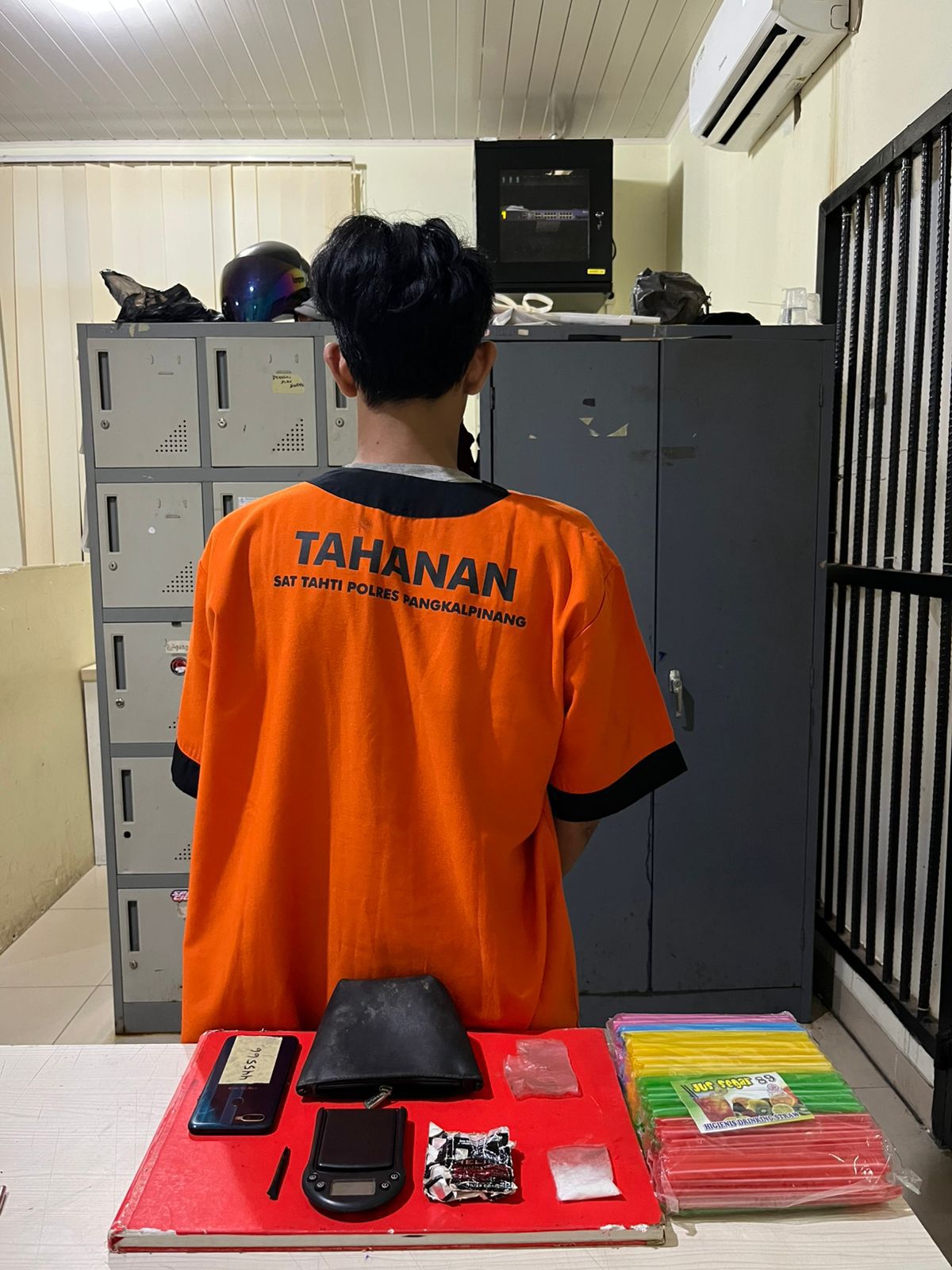 Penangkapan dilakukan di rumah tersangka yang beralamat di Jalan Kampung Melayu RT 002 RW 001, Kelurahan Bukit Merapin, Kecamatan Gerunggang, Kota Pangkalpinang. Saat penggeledahan yang disaksikan oleh Ketua RT setempat, polisi menemukan 1 bungkus plastik strip bening ukuran sedang berisi sabu yang disimpan dalam kotak rokok merek HELIUM di luar rumah. Tak hanya itu, tim juga menemukan tas hitam berisi timbangan digital, sekop dari sedotan plastik, ball sedotan, serta 1 unit handphone OPPO warna biru yang digunakan untuk komunikasi transaksi.